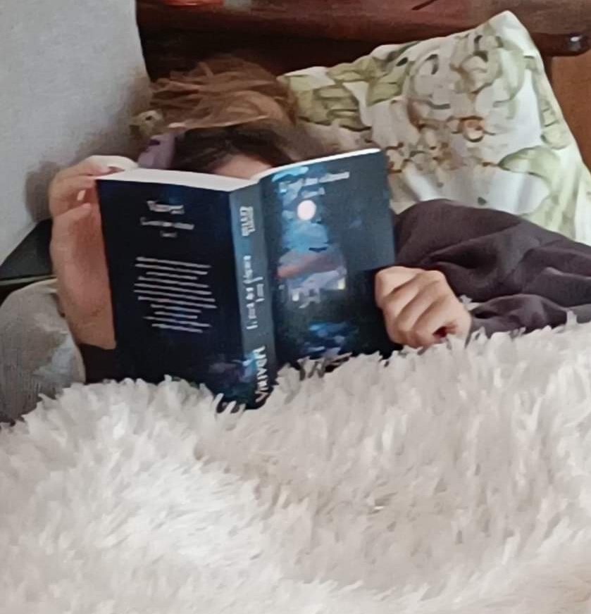 À gauche, Iris en train de lire la première édition, il y a quelques années de cela. Et à droite, la même en train de relire la nouvelle édition, en avant-première !