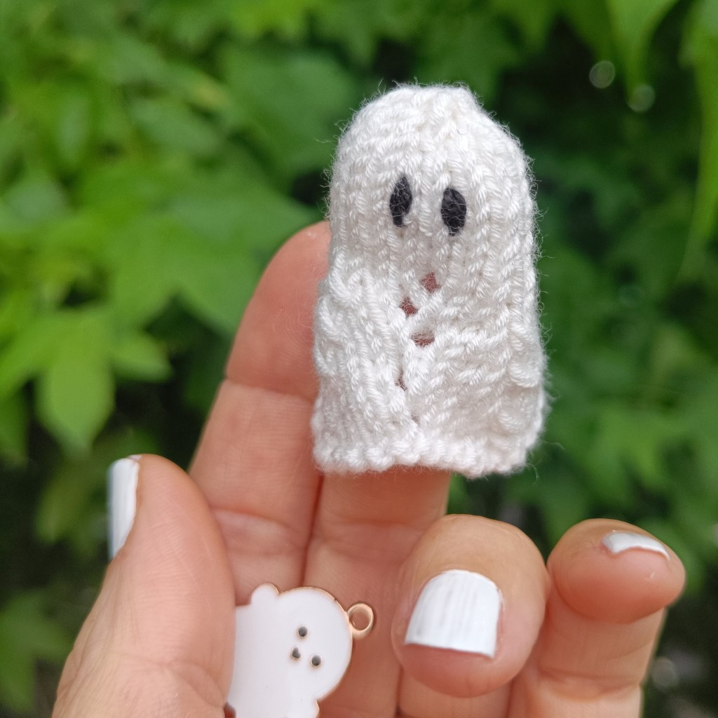 Le petit fantôme est réalisé en suivant un modèle gratuit « little ghosts », designé par Alexis Hamann-Nazaroff, qui demande pas mal de dextérité en tricot, et que je suis heureuse de confectionner pour vous !