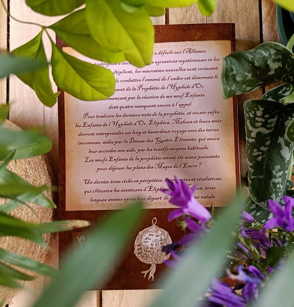 Pour traduire les derniers mots de la prophétie, et réunir enfin les Enfants de l’Hyphale d’Or, Éliphéra, Maloun et leurs amis devront entreprendre un long et hasardeux voyage vers des terres inconnues, aidés par la Déesse des Quatre Éléments, qui saura leur accorder son aide, par les évasifs moyens habituels.